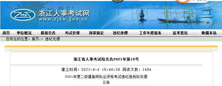 近日浙江省人事考試網(wǎng)發(fā)布《2021年度二級(jí)建造師執(zhí)業(yè)資格考試違紀(jì)違規(guī)擬處理公告》。此次共通報(bào)135人。